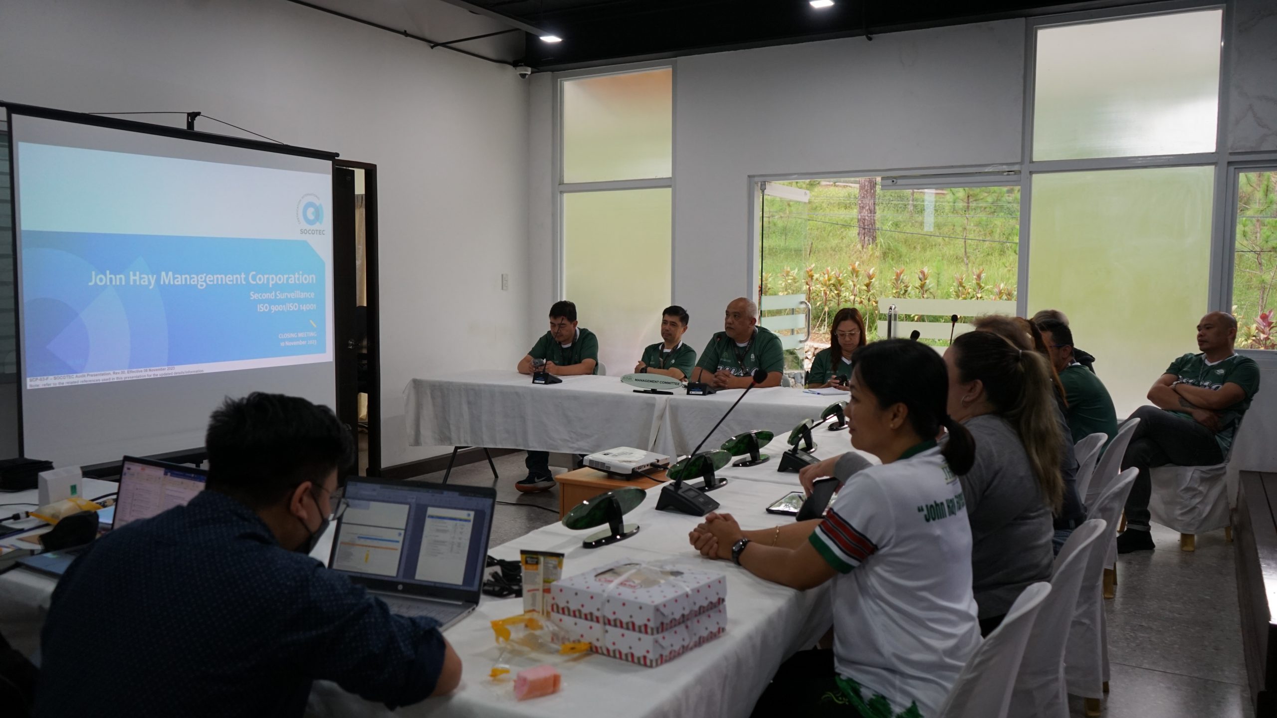 relation to the outcomes of the external audit. Therefore, John Hay Management Corporation is immediately recommended for continued certification to ISO 9001:2015 for the Quality Management System and ISO 14001:2015 for the Environmental Management System,” says Eugene Herradura, Lead Auditor of SOCOTEC. This wave of accomplishment that took over John Hay Management Corporation (JHMC) is a testament to its unwavering commitment to excellence and dedication to providing top-notch services. It resulted from SOCOTEC Certification Philippines Inc.’s Second Surveillance Audit, which took place on November 9–10, 2023. Dominating the findings were eight positive observations practiced by and reflected in JHMC’s practices, such as process automation, efficient implementation of the QMS and EMS, and the leadership and commitment exemplified by JHMC’s top management, among others. Commendably, no findings were found for both major and minor nonconformities.
